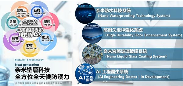 是台灣少數同時掌握:有機矽烷 × 無機矽酸鹽 × 奈米液態玻璃 × 土木工程等多領域整合能力的研發與製造團隊。