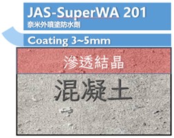 本產品係一種單組份多功能奈米水性混凝土防水劑,採用次世代最先進複合有無機矽的奈米塗層共價鍵結技術,該技術可生產超薄、透明、耐用的奈米塗層,幾乎可以粘接到任何基材上。JAS-SUPERWA 201防水劑塗層能有效滲入母材基面為混凝土、石材及木材,並於內部產生滲透結晶保護。該無膜塗層能與混凝土表面發生化學結合和交聯,以創造一個全新的奈米塗層表面,該表面具有堅固、防水、耐磨、耐污漬、耐腐蝕及耐久性能要