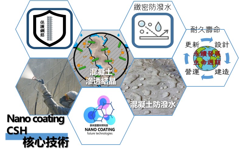 - 奈米液態技術:可與混凝土相容的次世代奈米塗層尖端科技。