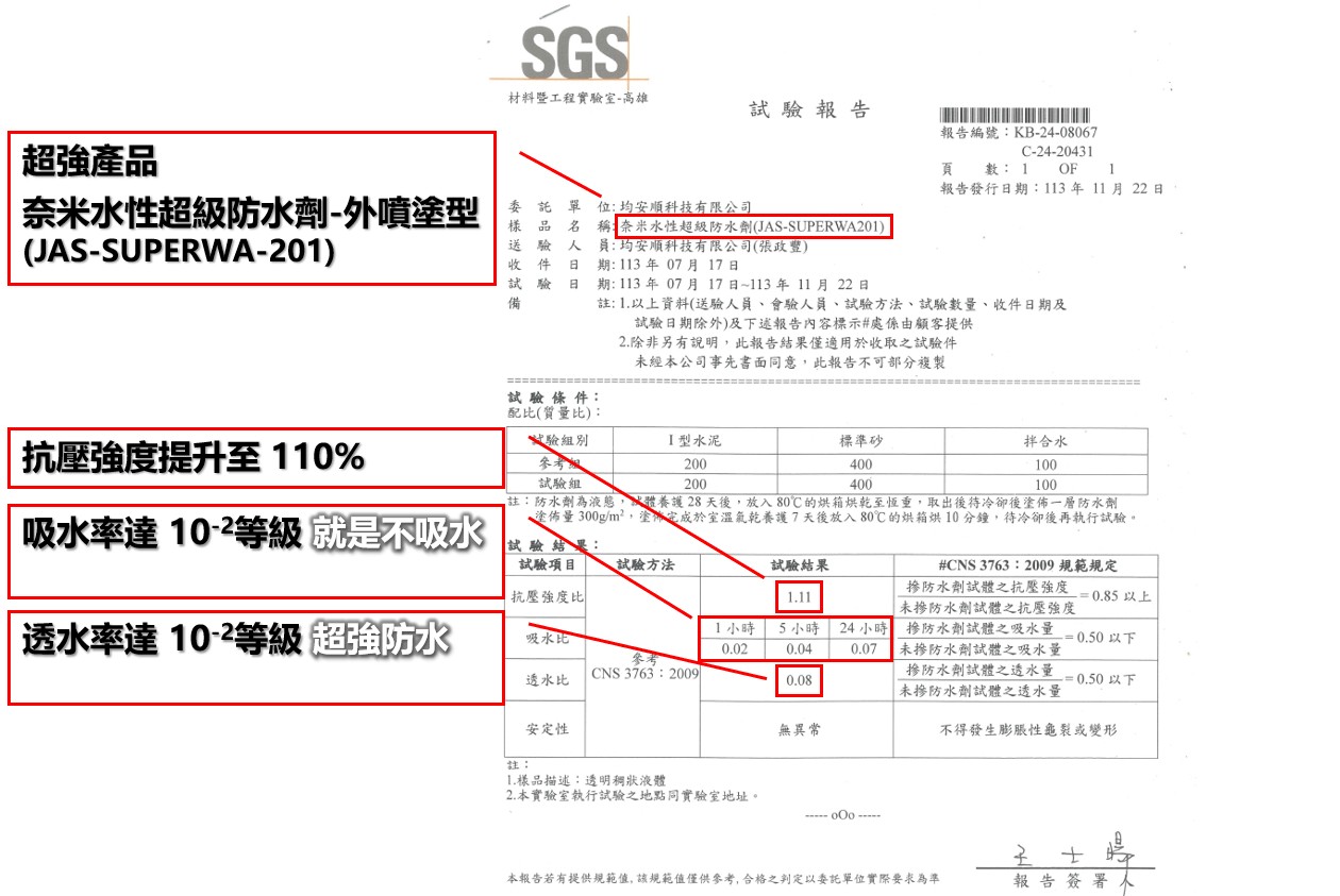 - JAS-SUPERWA-201 外噴塗防水劑,依CNS3763水泥防水劑測試結果,展現出超驚人成果,以外噴塗的功能效果使用,混凝土強度提昇11%,防水比及透水比達到小數點第二位等級,這-就是國家隊水準。