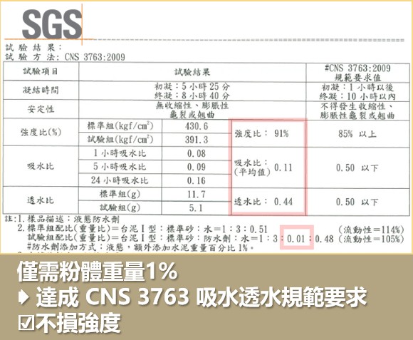 吸 水 比:摻和有防水劑者與未摻和者之吸水量比要0.50以下(CNS 3763:2009)。