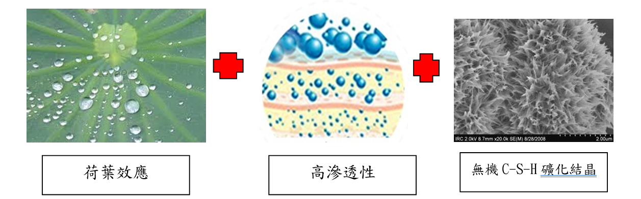 水溶性高滲透鋰基防水材料,能於混凝土內部生成 C-S-H 礦化結晶,深層填補孔隙並產生強效撥水荷葉效應,提升混凝土耐久、防水表現。